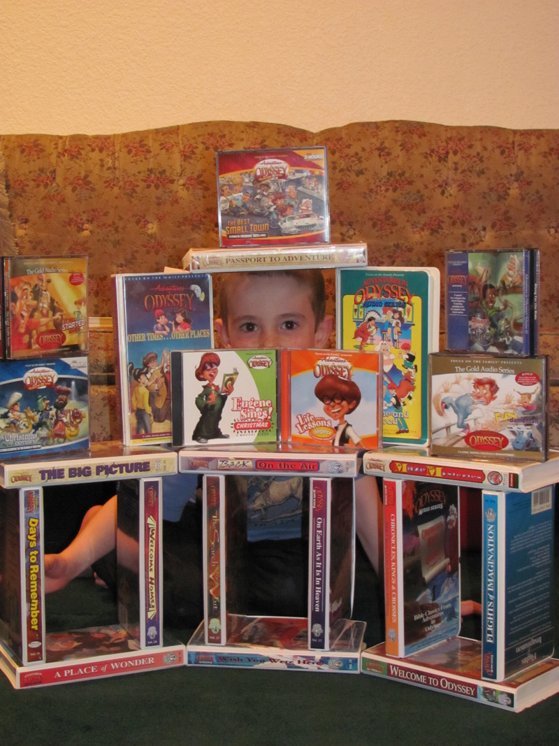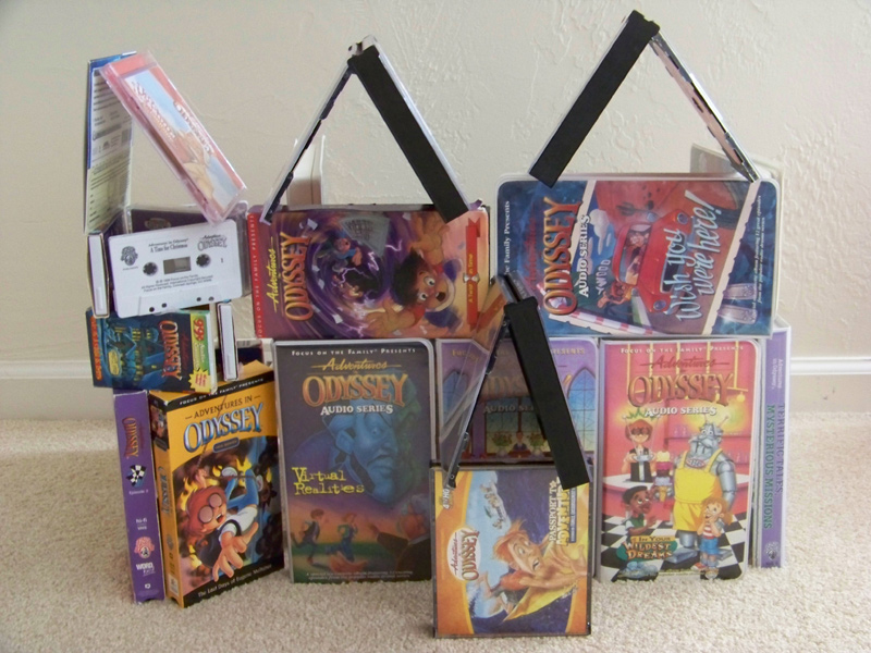 Joseph B., Age 17 (Cuba, Illinois) ─ I'm not sure if Joseph meant to do this while creating his display, but the foundation built out of Odyssey cassette clamshells pretty much says it all. Where would "Adventures in Odyssey" be today without the beginning era of reel-to-reel and cassettes, which are so often devoured by the tape player? Joseph's photo captures all eras of Odyssey's existence and even introduces some paper action figures of the new characters into the works! Very creative!